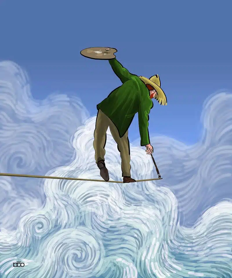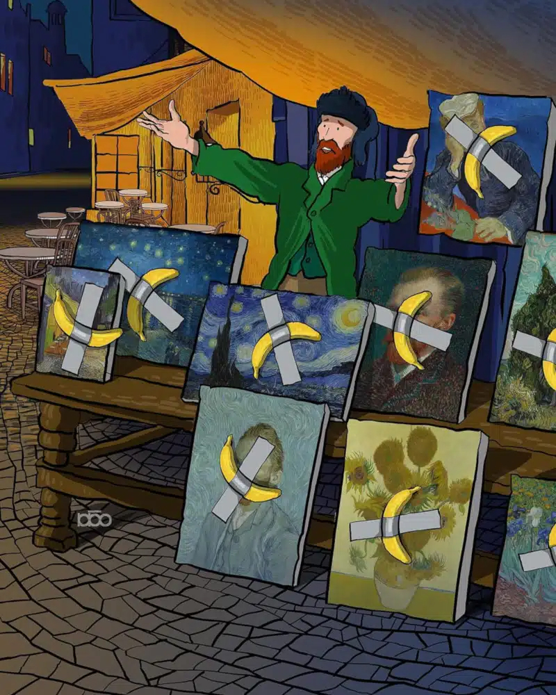In Moghaddam's illustration, Van Gogh stands behind a stall, selling some of his most famous paintings. There's everything from Starry Night and his self-portrait to Sunflowers and Irises. But there’s one glaring difference—they all have a banana taped to the center of the canvas. A desperate Van Gogh raises his arms, as if begging passersby to check out these updated creations.