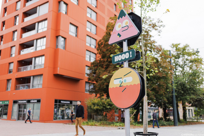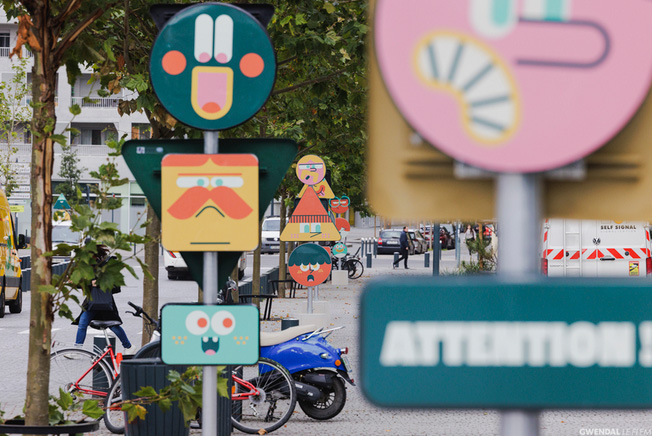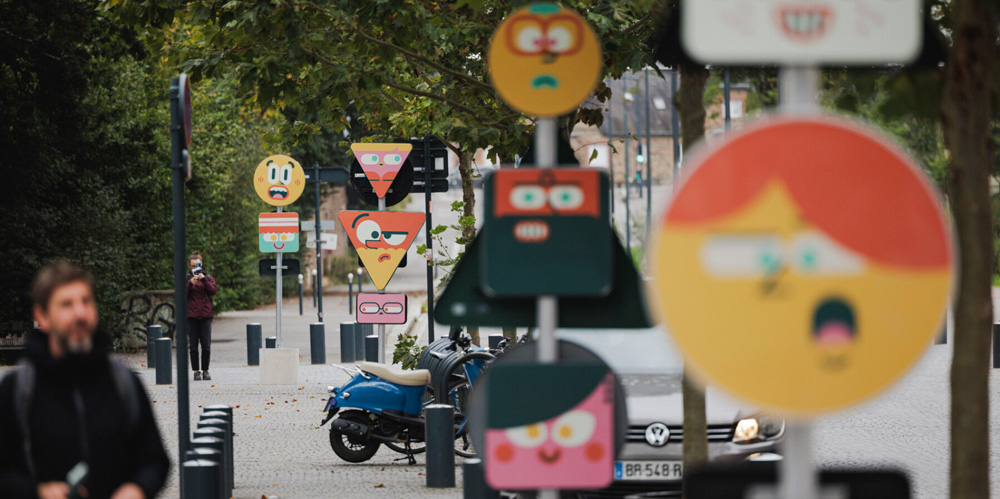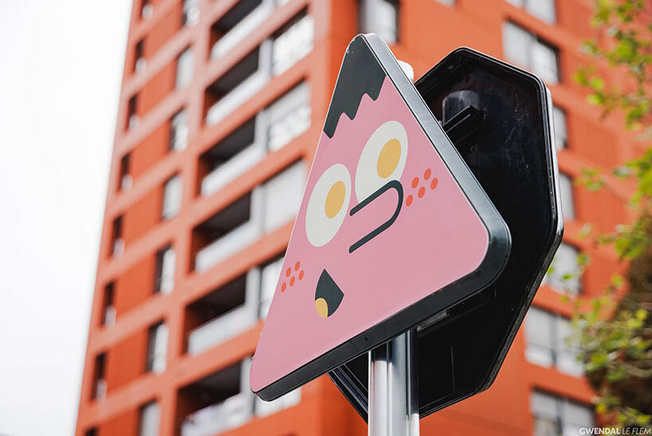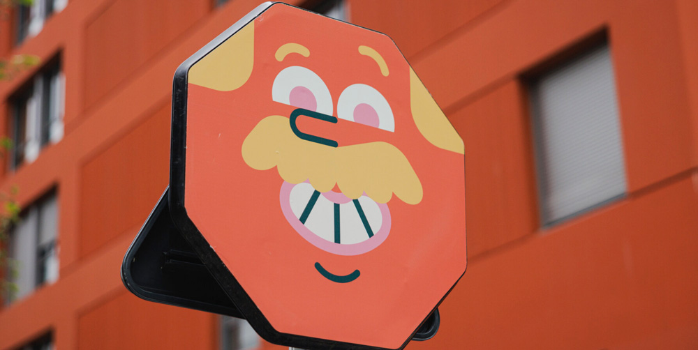 The traffic signs by illustrator Wood Campers and creative practice ilta studio inject a burst of color and character into the streets, showcasing a lively array of playful designs. Cheerful faces with freckled cheeks, mischievous grins, quirky hairstyles, grumpy pouts, and eccentric mustaches populate the district, captivating the attention of both pedestrians and motorists. Each sign, repurposed from original traffic markers, comes in various shapes and sizes, often stacked to amplify their visual impact. Alongside these illustrations, written messages urge drivers to slow down, blending humor and charm with a serious purpose. This inventive graphic design approach seeks to heighten awareness and encourage safer behavior in an unconventional yet effective way.