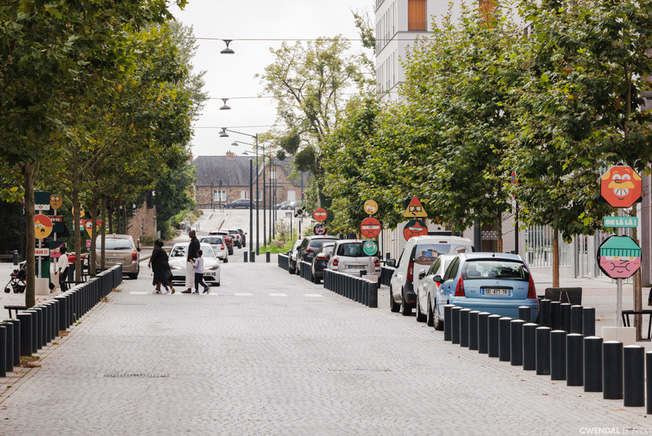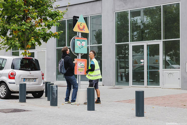 Playful characters pop out of wood campers` customized traffic signs in rennes, france