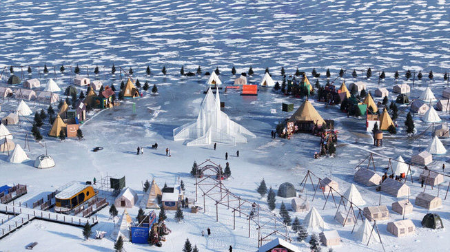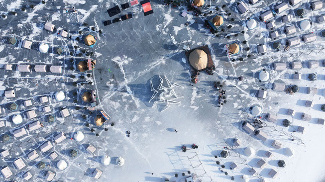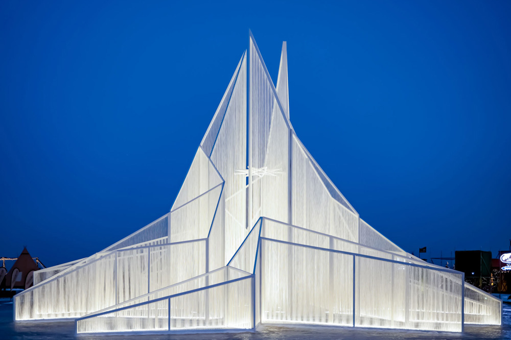Designboom_ The White Flame art installation, designed by Space10 Studio, was commissioned by JV Communication for the Kalun Lake Art Festival. The project draws heavily on the cultural and environmental characteristics of the Northeast region of China. The area’s natural landscape, marked by distinct seasons, is defined by mountains, lakes, and winter snow. Kalun Lake, located on the outskirts of Changchun City, transforms into a frozen ice field each winter, creating a unique seasonal landscape. This temporary environment serves as a gathering space for local residents to celebrate and connect with the natural world.