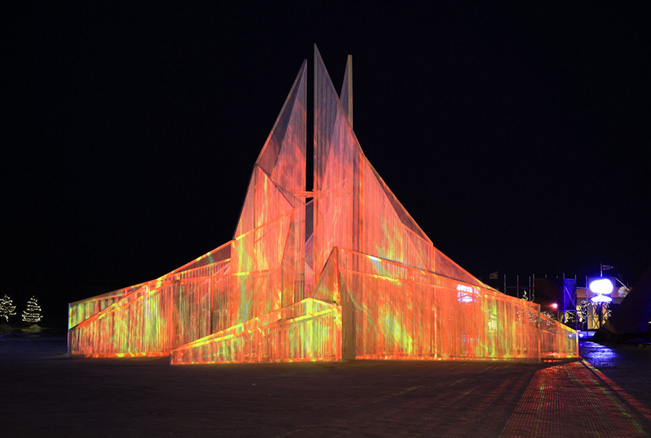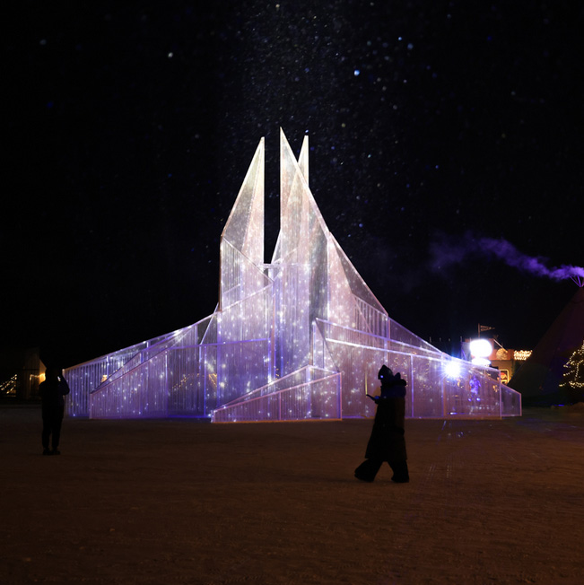 As daylight fades, the installation transforms. Illuminated by internal lighting, it emits a soft, clear glow reminiscent of gemstones. The interplay of light and material produces dynamic optical effects, drawing parallels to auroras and crystalline structures. This transformation emphasizes the transient beauty of light and shadow, aligning with the temporary nature of the icy environment.