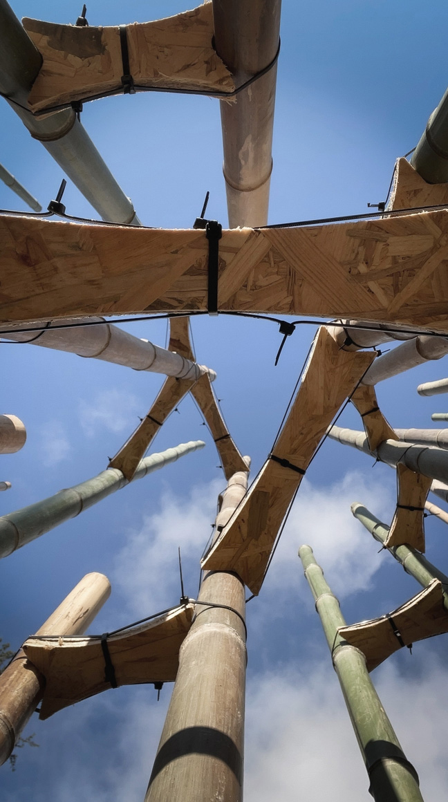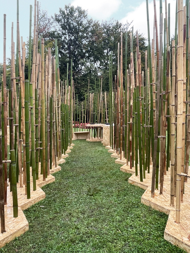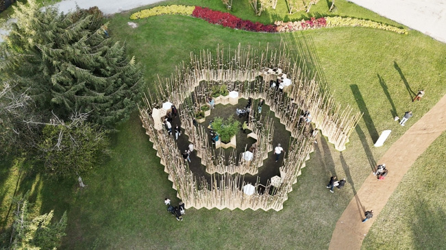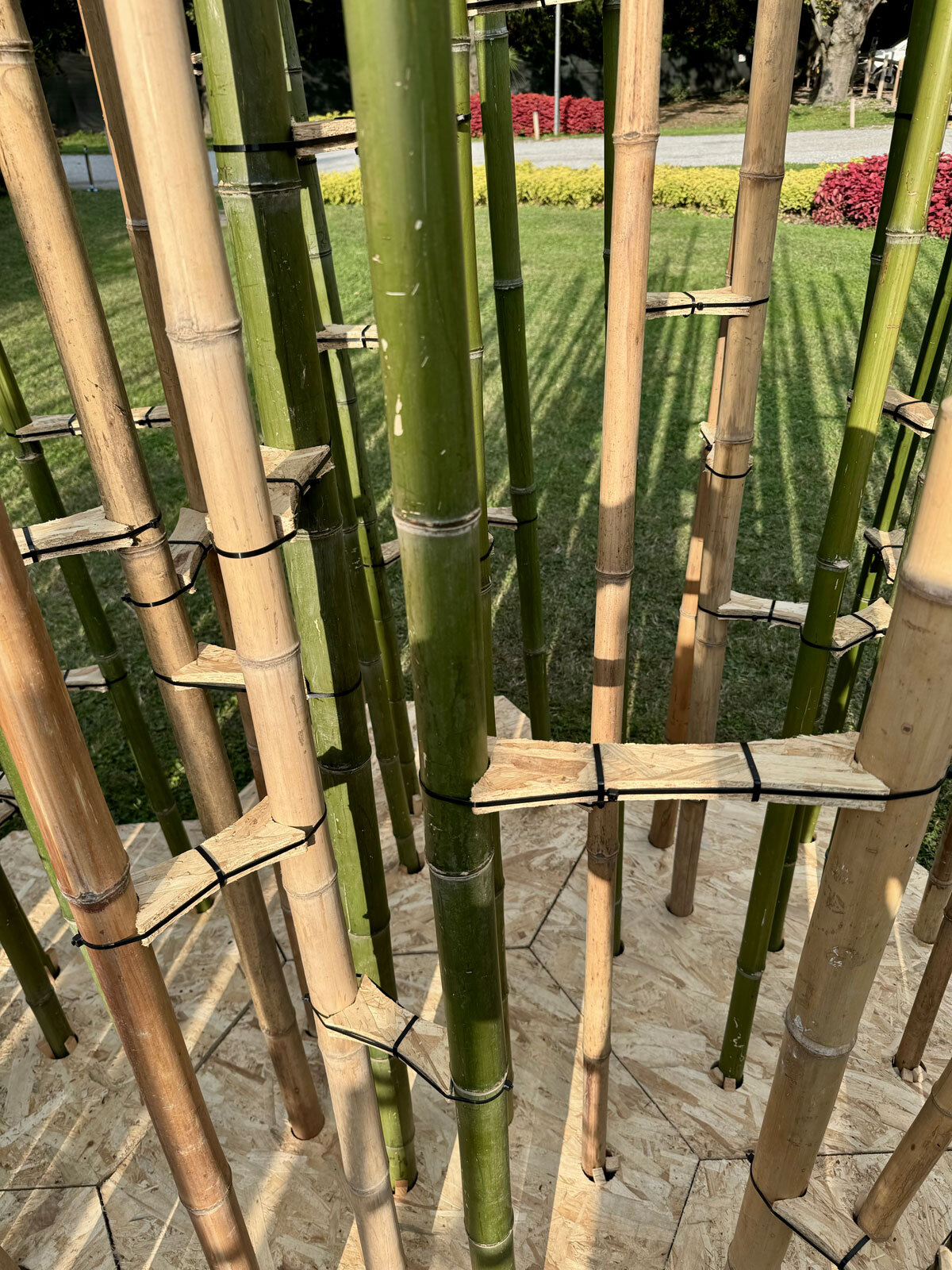 The pavilion’s design integrates both aesthetic and functional elements while prioritizing sustainability. The structure is supported by 127 OSB plywood hexagons, ensuring stability and durability. The 1,625 bamboo canes of varying sizes create an organic, dynamic appearance, reminiscent of a bamboo grove. Bamboo’s natural color and texture variations enhance the sensory experience, while its versatility supports sustainability and circularity. Bamboo is a rapidly renewable resource with a high annual yield. It acts as a carbon sink, capable of sequestering up to three times more CO₂ than hardwood trees, with a capacity of up to 50 tons per hectare annually. Additionally, bamboo’s lightweight nature reduces construction emissions by minimizing the need for heavy machinery.