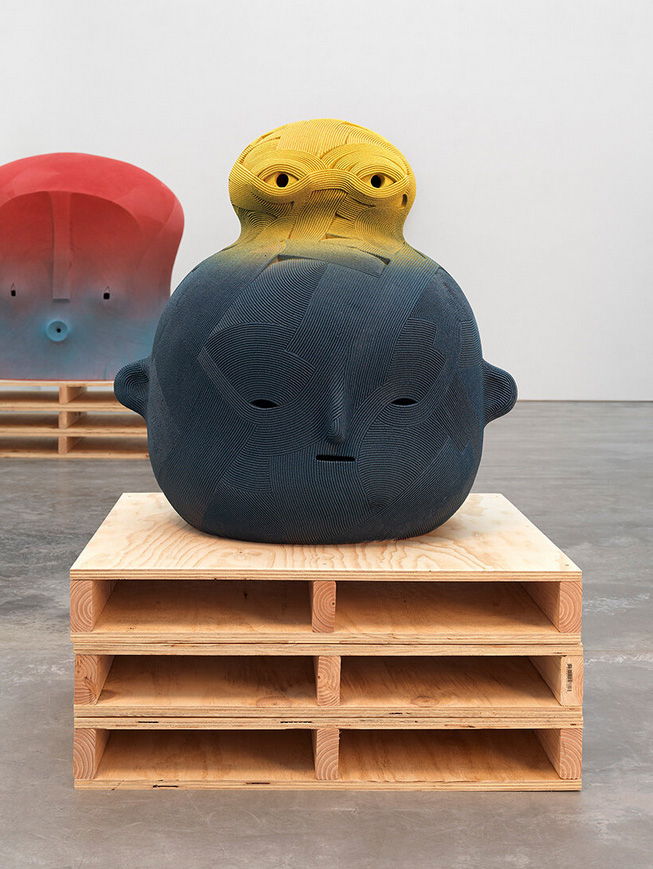 In addition to the Mask series, the exhibition features works from Iwamura’s ‘Neo Jomon: Stacking Neighbor’ series. These sculptures were inspired by the artist’s observations of his son exploring the world through play. Like stacked toys, the ceramic sculptures are composed of two parts that fit together dynamically to form cohesive pieces. The vibrant glazes, soft forms, and textured surfaces are hallmarks of Iwamura’s distinctive artistic style.