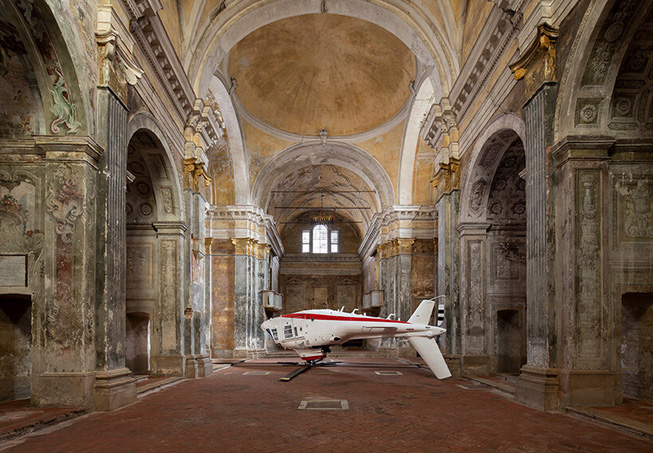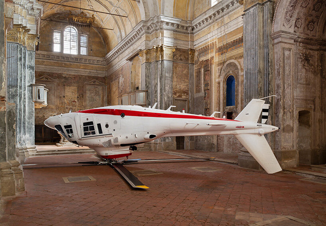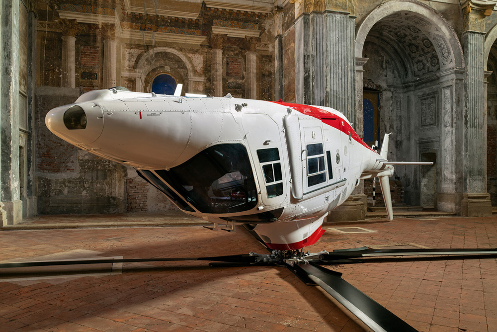 Designboom_ Paola Pivi returns with a large-scale intervention, turning an Agusta 109 helicopter upside down inside the deconsecrated Church of San Carlo in Cremona. The site-specific installation, titled A Helicopter Upside Down, transforms the 17th-century nave into an uncanny scene where motion meets stillness, and the familiar is rendered surreal. By inverting the aircraft—an object synonymous with flight and function—Pivi challenges the expectations of the viewers, creating visual tension between its imposing material presence and its newfound stillness. On view by appointment at San Carlo until June 2025, the installation continues Pivi’s exploration of the unexpected and the extraordinary in contemporary art.