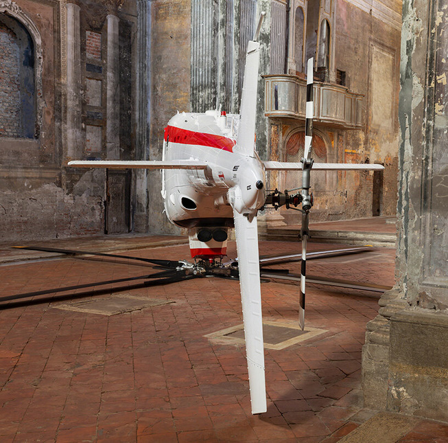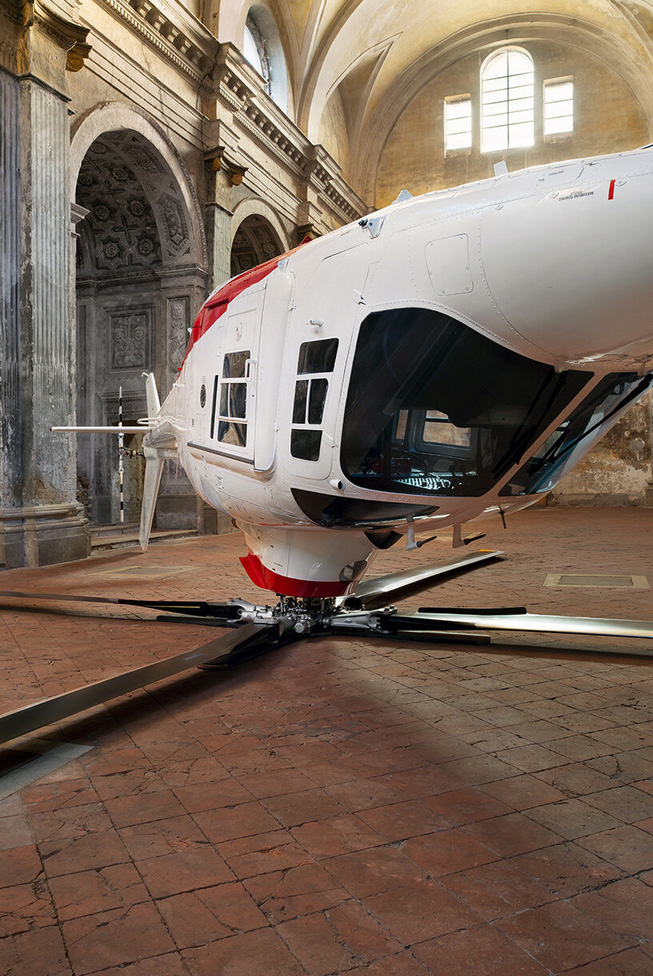 In the case of A Helicopter Upside Down, the setting amplifies the disorienting effect. The baroque interiors of San Carlo—a space once imbued with ritual and transcendence—now house a machine suspended in an unfamiliar state of inertia. The dialogue between architecture and object fosters a paradox: a helicopter at rest, yet poised for movement, rendered at once tangible and surreal. Visitors navigate around the inverted aircraft, engaging with the piece in a way that shifts perspectives, inviting reflection on control, gravity, and expectation.