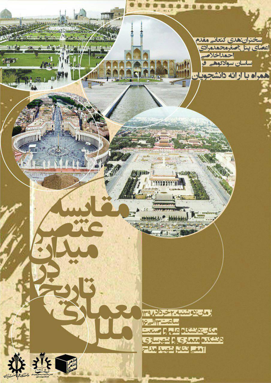 نشست "مقايسه عنصر ميدان در تاريخ معمارى ملل" روز دوشنبه 20 خردادماه 98 در دانشگاه علم و صنعت برگزار مي شود.
