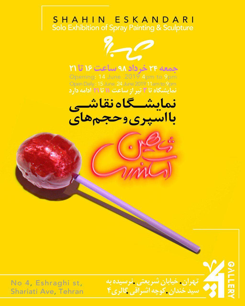 نمايشگاهي از نقاشي با اسپري و حجم هاي شاهين اسکندري با محوريت نور روز جمعه ٢٤ خرداد ماه ٩٨ از ساعت 16 الي 21 در گالرى چهار تهران در معرض ديد عموم قرار خواهد گرفت.