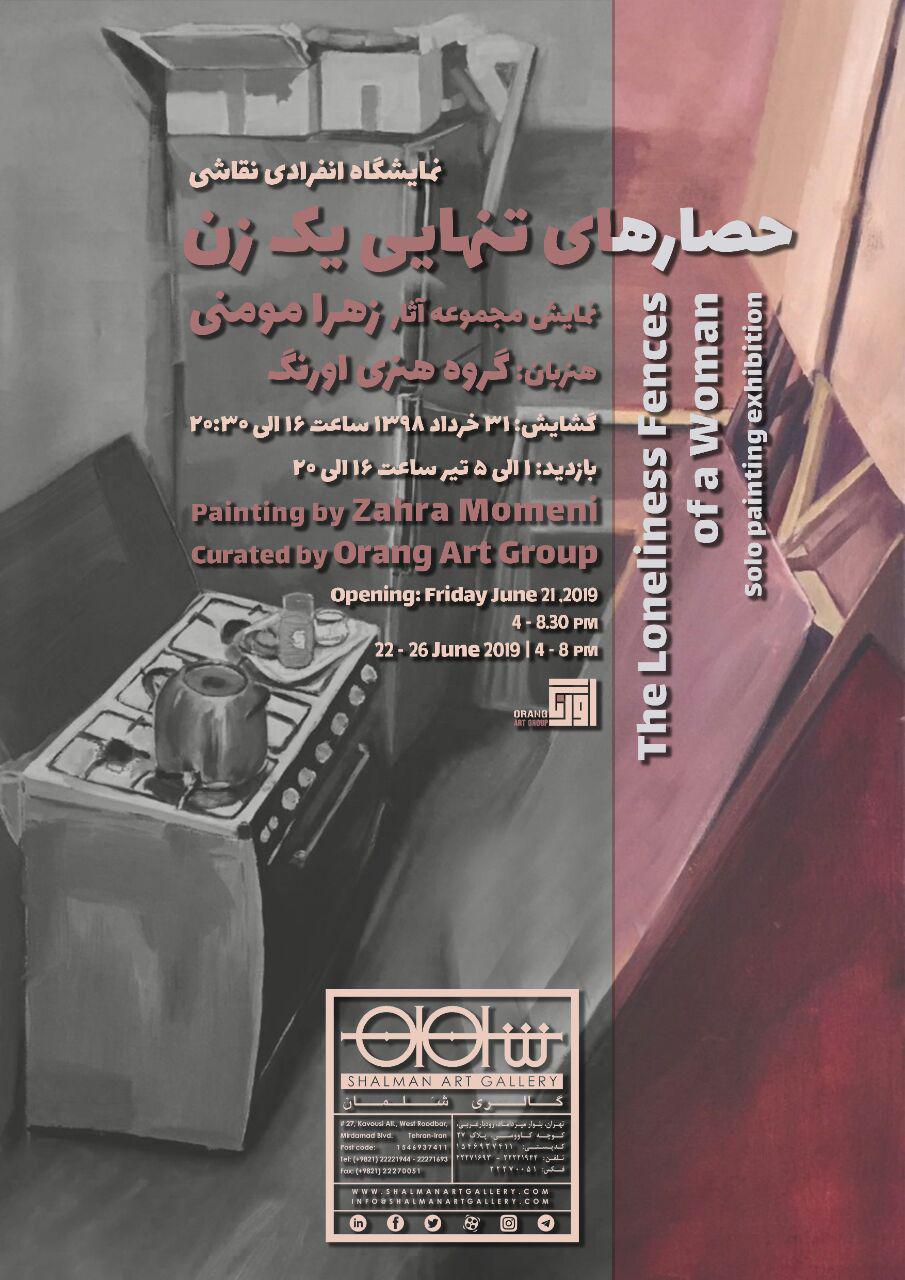 نمايشگاهي از نقاشي هاي زهرا مومني به هنرباني گروه هنري اورنگ تحت عنوان "حصارهاي تنهايي يک زن" روز جمعه 31 خردادماه از ساعت 16:30 الي 20:30 در گالري شلمان برگزار مي شود.