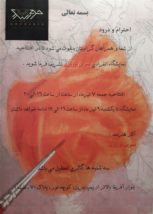 نمايشگاهي از نقاشي هاي نسرين نورورزي از ساعت 16 الي 20 روز جمعه هفتم تيرماه در گالري خورشيد برپا مي شود.
