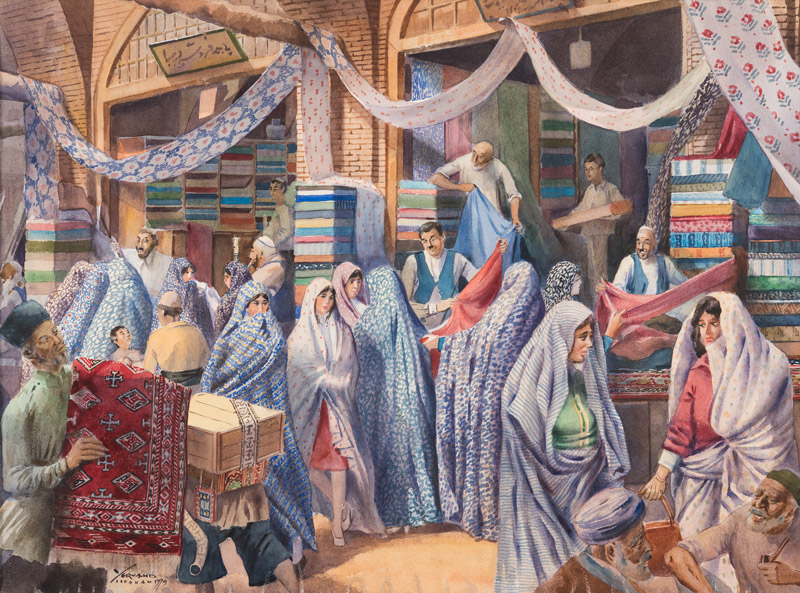 بازار پارچه فروشان يرواند نهاپتيان با تکينيک آبرنگ و ابعاد ۷۳×۵۵ سانتيمتر به قيمت 95 ميليون تومان به فروش رفت.