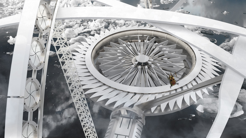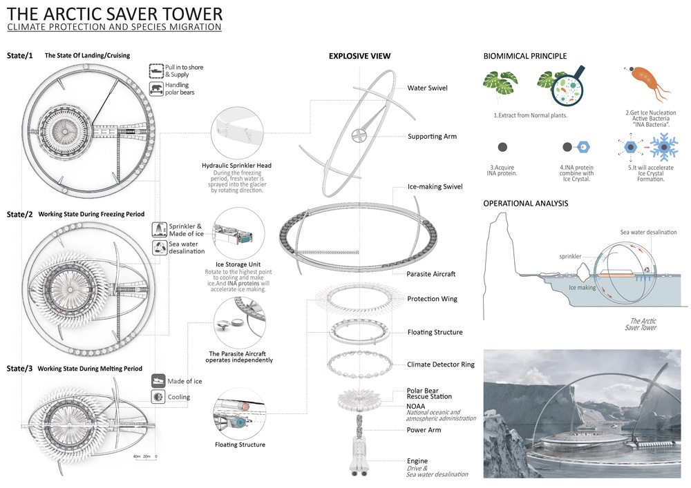 به گزارش گالري آنلاين، اين طرح نامزد دريافت جوايز مختلف بين المللي شده است، برج محافظ قطب شمال کار yiyang xu و jingyi ye است و مي تواند فصل ذوب شدن را در نقاط بحراني مختلف دايره قطب شمال که به طور زياد تحت تاثير گرم شدن جهاني است، گسترش دهد. اين ساز و کار بلندپروازانه هر آوريل، زماني که يخ ها شروع به ذوب شدن مي کنند، آغاز مي شود. در آن مدت زمان، قاب بيروني برج شروع به چرخيدن ميکند، در حالي که واحد زير آب سطحي ذخيره آب را شروع مي کند. وقتي که دو واحد بالاتر از سطح آب در هنگام چرخش در معرض هواي سرد قرار مي گيرند، آب داخلي دريا شروع به يخ زدن مي کند. واحد ذخيره يخ در خارج قرار گرفته زماني که قاب بيروني در سطح دريا مي چرخد و يخ ذوب مي شود، گرما را در جو جذب ميکند و باعث افزايش دماي مي شود و در نتيجه طول دوره ي ذوب را افزايش مي دهد.
