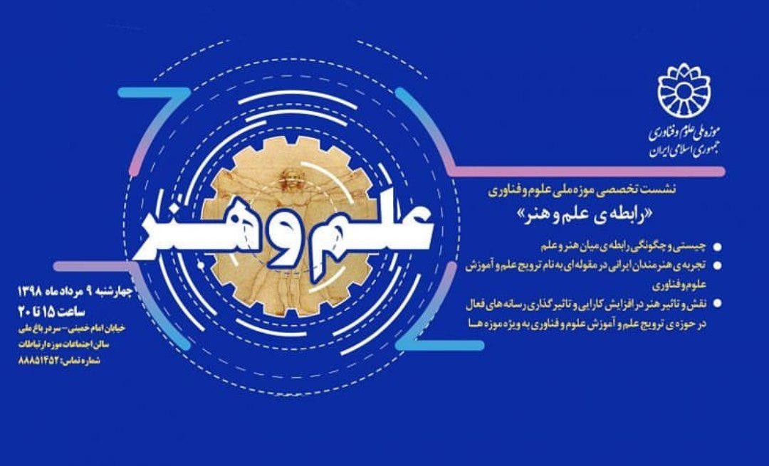 نشست تخصصي موزه ملي علوم و فناوري تحت عنوان "رابطه ي علم و هنر" چهارشنبه 9 مردادماه در موزه ارتباطات برگزار مي شود.