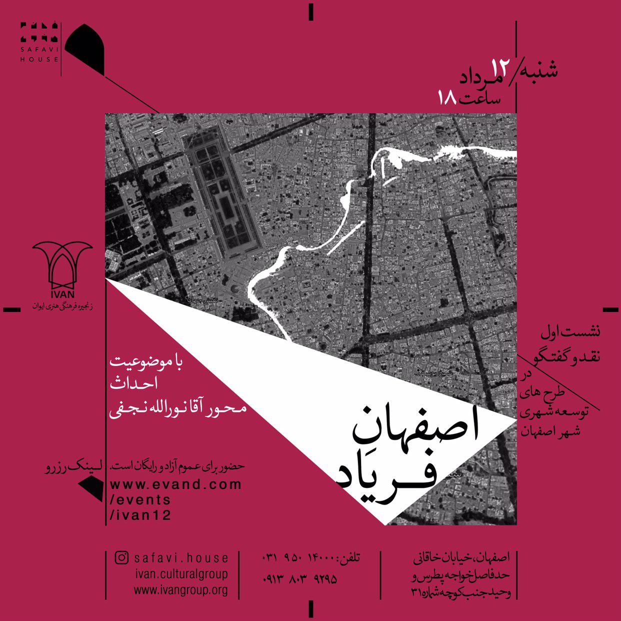 نشست "اصفهانِ فرياد"، اولين نشست نقد و گفتگو در طرح هاي توسعه شهري شهر اصفهان است که با موضوعيت احداث محور آقا نورالله نجفي شنبه 12 مرداد ماه در خانه صفوي برگزار مي شود.
