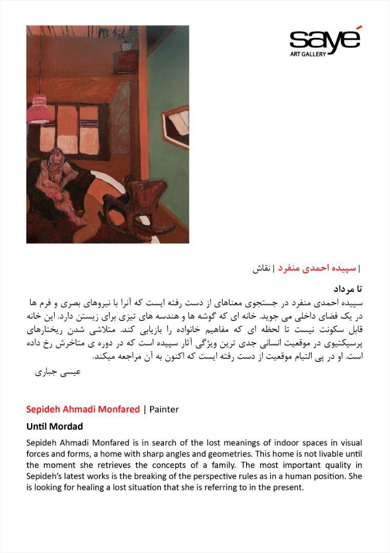 تامرداد، عنوان نمايشگاه آثار نقاشي سپيده احمدي منفرد در گالري سايه است که از روز جمعه يازدهم مرداد ماه 98 افتتاح خواهد شد.