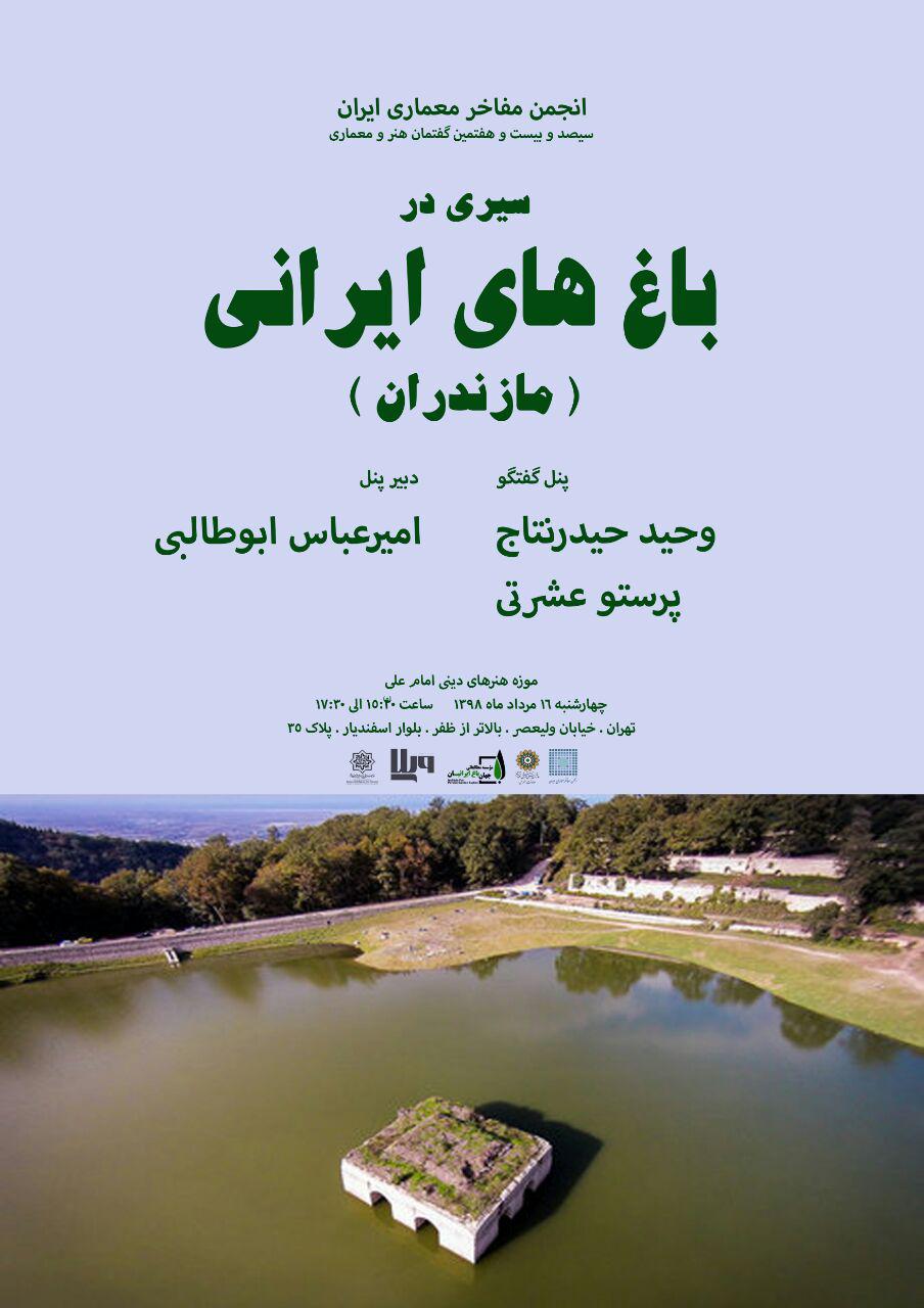 سيصد و بيست و هفتمين گفتمان هنر و معماري انجمن مفاخر معماري ايران با موضوع "سيري در باغهاي ايراني مازندران" چهارشنبه 16 مرداد 1398 در موزه هنرهاي ديني امام علي برگزار مي شود.