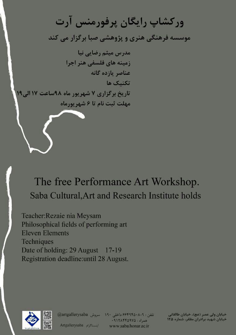 به گزارش گالري آنلاين به نقل از روابط عمومي موسسه فرهنگي هنري صبا- وابسته به فرهنگستان هنر- در اين کارگاه يکروزه که در تاريخ ۷ شهريورماه از ساعت ۱۷ الي ۱۹ در محوطه اين مجموعه برگزار مي شود، هنرجويان و شرکت کنندگان، با همه چيز اين هنر، از ريشه هاي فلسفي، زمينه هاي تاريخي، بنيادهاي زيباشناختي، عناصر يازده گانه، تا تکنيکها و شيوه هاي اجرا و سير تحول اين هنر در چنددهه از تاريخ هنر مدرن و معاصر جهان، بروايت يکي از هنرمندان فعال و پرسابقه پرفورمنس در ايران آشنا خواهند شد.