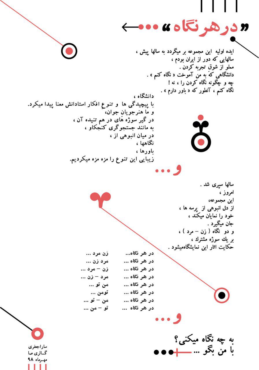 نمايشگاه "در هرنگاه" تا ۱۴ مهرماه همه روزه بجز دوشنبه ها از ساعت ۱۶ الي ۲۰ در گالري صا به نشاني خيابان پاسداران، بوستان ۸، پلاک ۱۳۴، طبقه همکف داير خواهد بود.