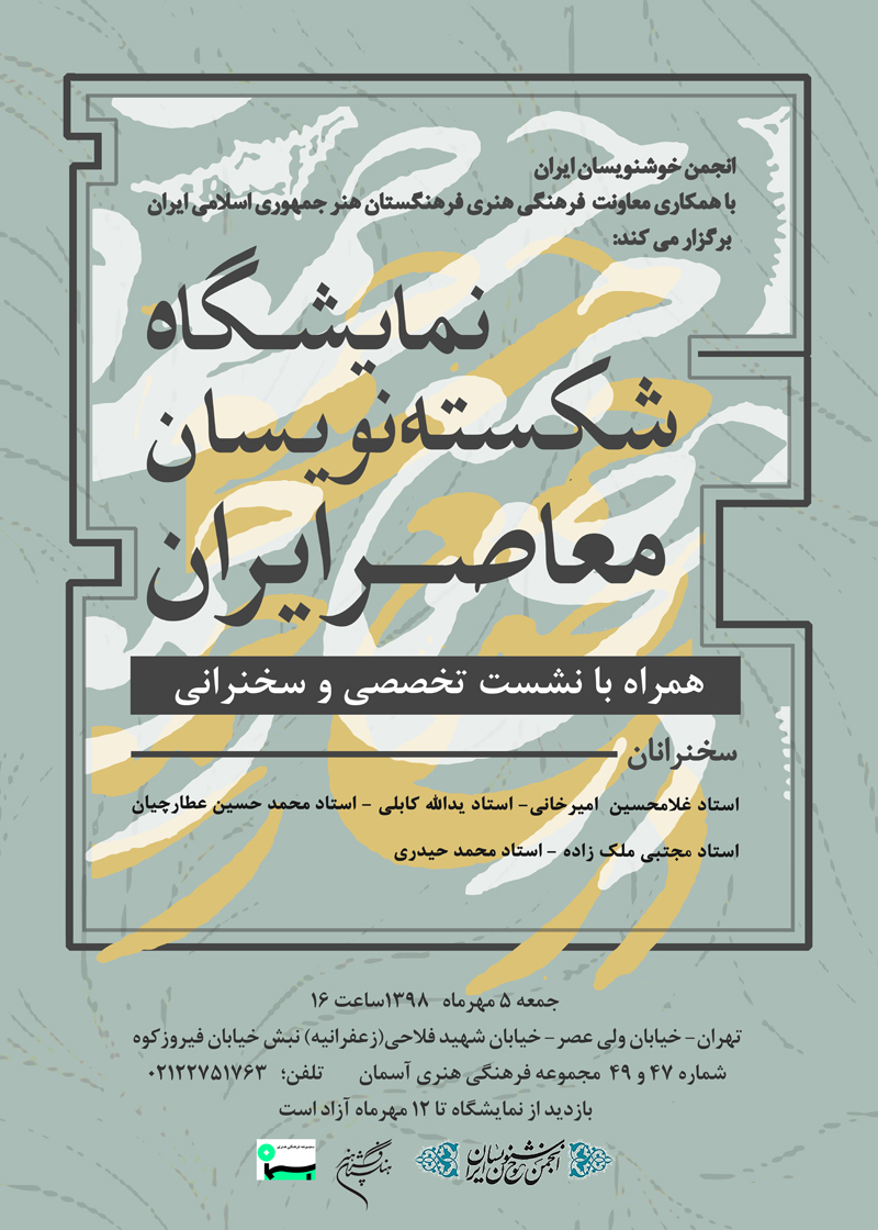 نمايشگاه و نشست تخصصي شکسته‌نويسان معاصر ايران، به همت انجمن خوش‌نويسان ايران و معاونت فرهنگي‌ و هنري فرهنگستان هنر جمهوري اسلامي ايران برگزار مي‌شود.