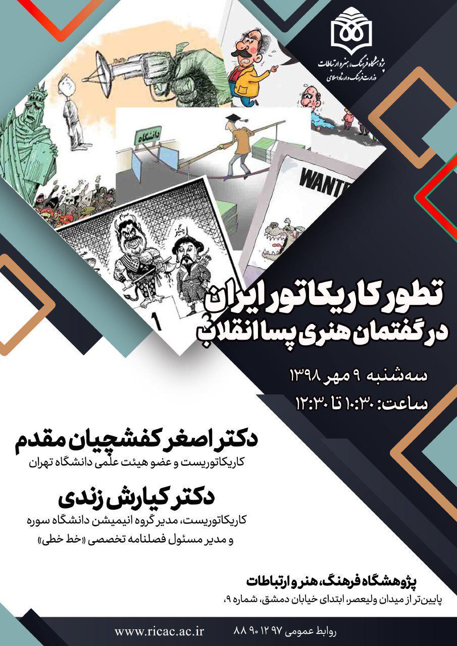 نشست تخصصي «تطور کاريکاتور ايران در گفتمان هنري پسا  انقلاب» با هدف بررسي تطور کاريکاتور پس از انقلاب اسلامي ايران و شناسايي زمينه‌هاي به‌کارگيري اين هنر در ديپلماسي فرهنگي، روز سه‌شنبه ۹ مهر ۹۸، از ساعت ۱۰:۳۰ تا ۱۲:۳۰ در پژوهشگاه فرهنگ، هنر و ارتباطات برگزار مي‌شود.