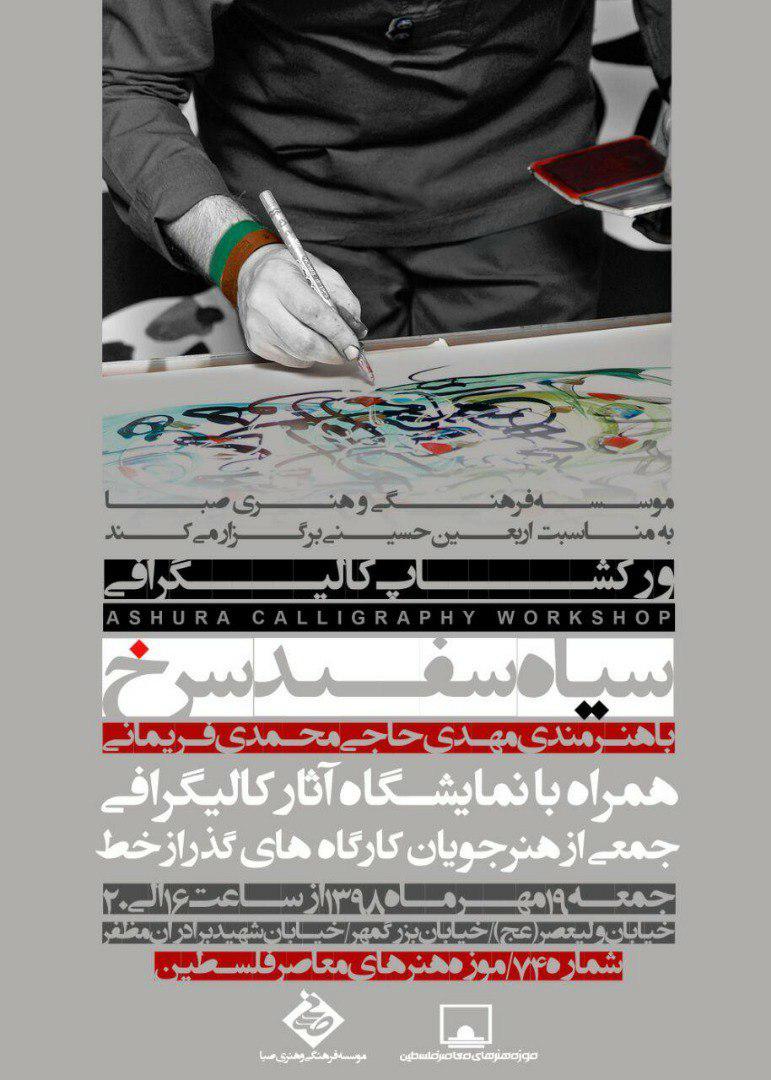 موسسه فرهنگي هنري صبا به مناسبت اربعين حسيني، ورکشاپ کاليگرافي مهدي حاجي محمدي فريماني را در موزه فلسطين برگزار ميکند.