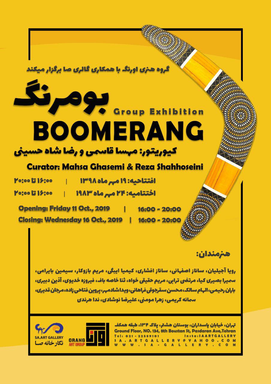 نمايشگاه گروهي هنرهاي تجسمي تحت عنوان "بومرنگ" به کيوريتوري مهسا قاسمي و رضا شاه حسيني از عصر روز جمعه 19 مهرماه در گالري صا برپا مي شود.