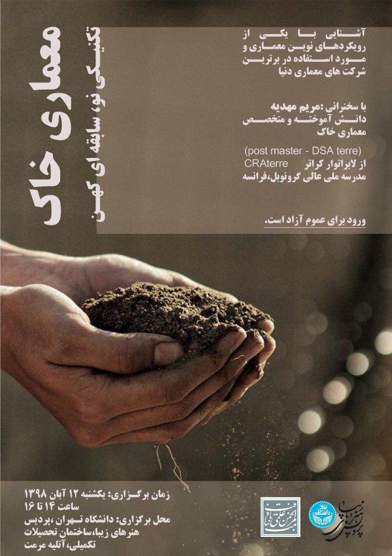 همايش "معماري خاک" از ساعت ۱۴ الي ۱۶ روز يکشنبه ۱۲ آبان ۱۳۹۸ در آتليه مرمت ساختمان تحصيلات تکميلي پرديس هنرهاي زيباي دانشگاه تهران برگزار مي شود.