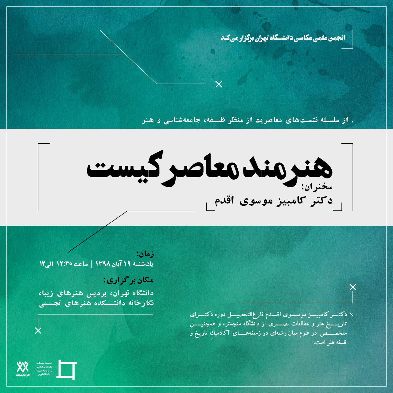 انجمن علمي عکاسي دانشگاه تهران، دومين جلسه از سلسله نشست هاي معاصريت از منظر فلسفه، جامعه شناسي و هنر را تحت عنوان "هنرمند معاصر کيست" يکشنبه 19 آبان ماه 98 در دانشگاه تهران برگزار مي کند.