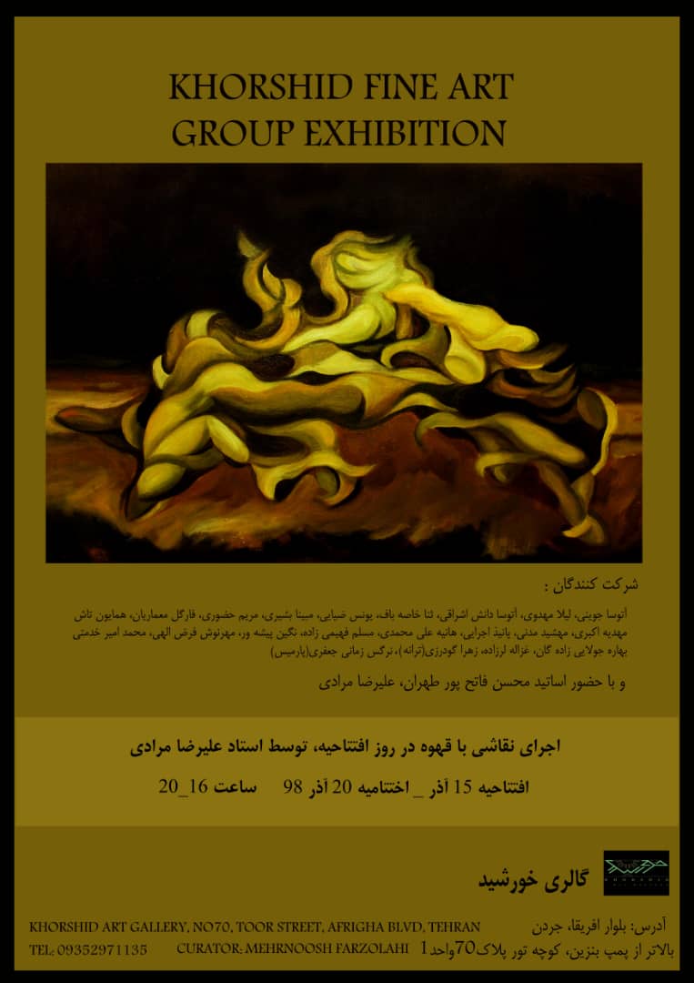 نمايشگاه گروهي فاين آرت با آثاري در رشته هاي نقاشي، طراحي و حجم از عصر روز جمعه 15 آذرماه در گالري خورشيد برپا مي شود.