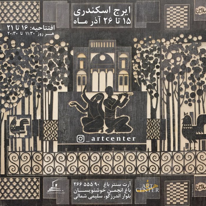 نمايشگاهي از آثار ايرج اسكندري از روز جمعه 15 آذرماه ار ساعت ١٦ الي ٢١ در گالري آرت سنتر باغ برپا مي شود.