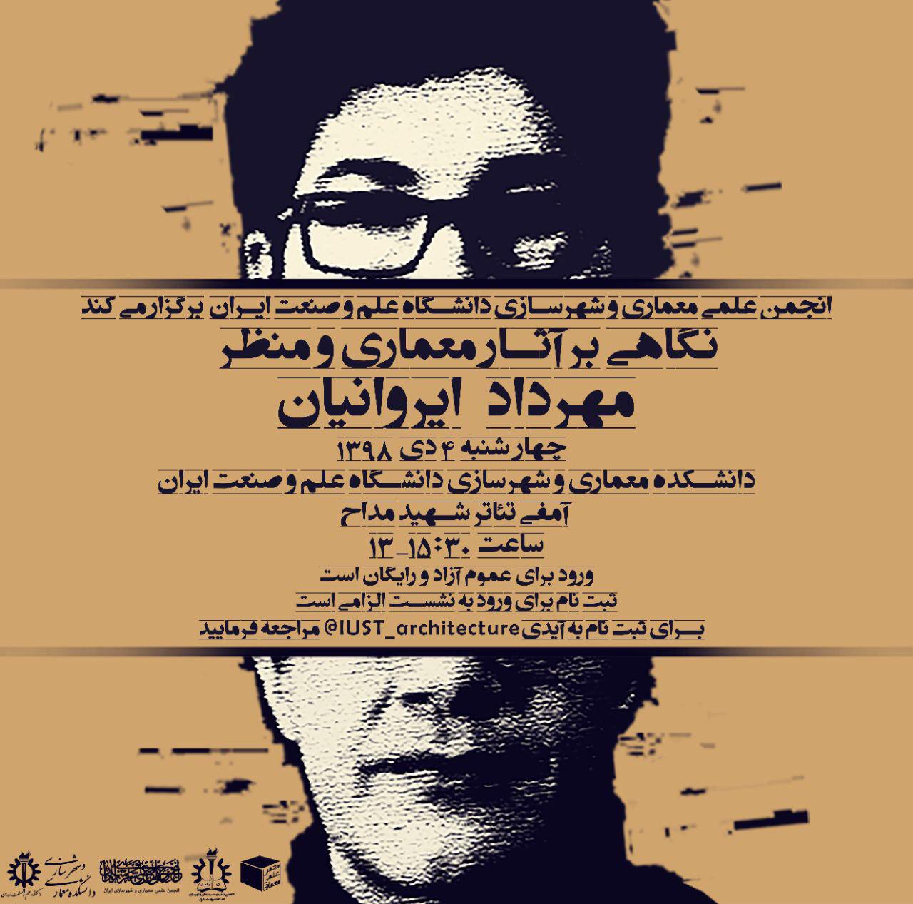 انجمن علمى معمارى دانشگاه علم و صنعت نشست "نگاهى بر آثار معمارى و منظر مهرداد ايروانيان" را چهارشنبه ٤ دى ماه ٩٨ برگزار مي کند.