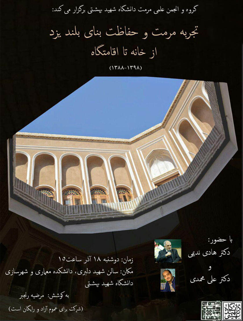 گروه و انجمن علمي مرمت دانشگاه شهيد بهشتي سمينار "تجربه مرمت و حفاظت بناي بلند يزد؛ از خانه تا اقامتگاه (۱۳۹۸-۱۳۸۸)" را دوشنبه، ۱۸ آذر در دانشگاه شهيد بهشتي برگزار ميکند.