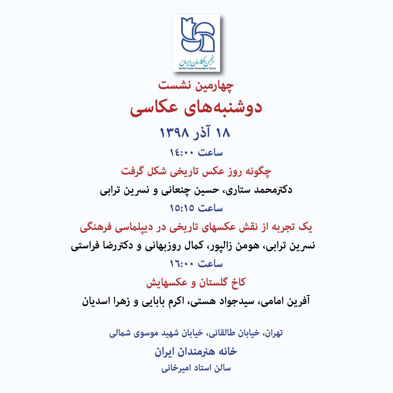 نشست چهارم از برنامه "دوشنبههاي عکاسي" با سه موضوع "چگونه روز عکس تاريخي شکل گرفت"، "يک تجربه از نقش عکسهاي تاريخي در ديپلماسي فرهنگي" و "کاخ گلستان و عکسهايش" دوشنبه 18 آذر 1398 در خانه هنرمندان ايران برگزار مي شود.