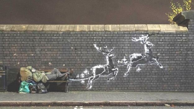 به گزارش گالري آنلاين، بنکسي فيلمي را در اينستاگرام خود منتشر کرده که نشان ميدهد مردي بيخانمان به نام رايان روي نيمکتي دراز کشيده که دو گوزن شمالي نيمکت او را مانند سورتمه بابانوئل ميکشند. اين گرافيتي روي ديواري آجري در راسته جواهرفروشان شهر بيرمنگام نقاشي شده است.