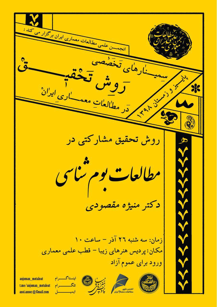 چهارمين سمينار از سلسله سمينارهاي تخصصي روش تحقيق در مطالعات معماري تحت عنوان «روش تحقيق مشارکتي در مطالعات بوم شناسي» سهشنبه 26 آذر در پرديس هنرهاي زيبا برگزار مي شود.