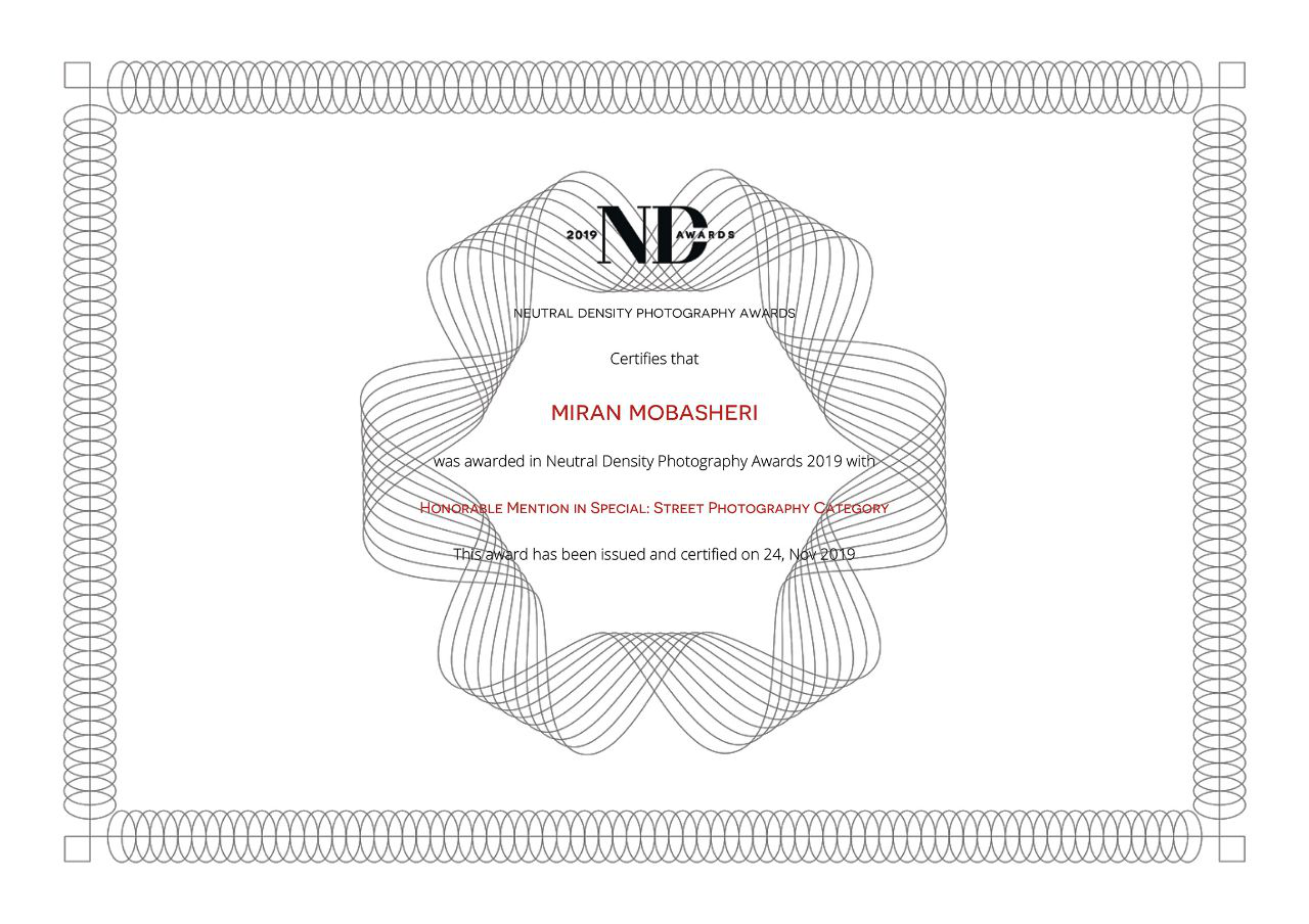 عنوان شايسته تقدير هيات داوران در بخش حرفه اي عکاسي خياباني جشنواره بين المللي عکس «ND AWARDS 2019» در استکهلم-سوئد به ميران(شورش) مباشري از ايران رسيد.