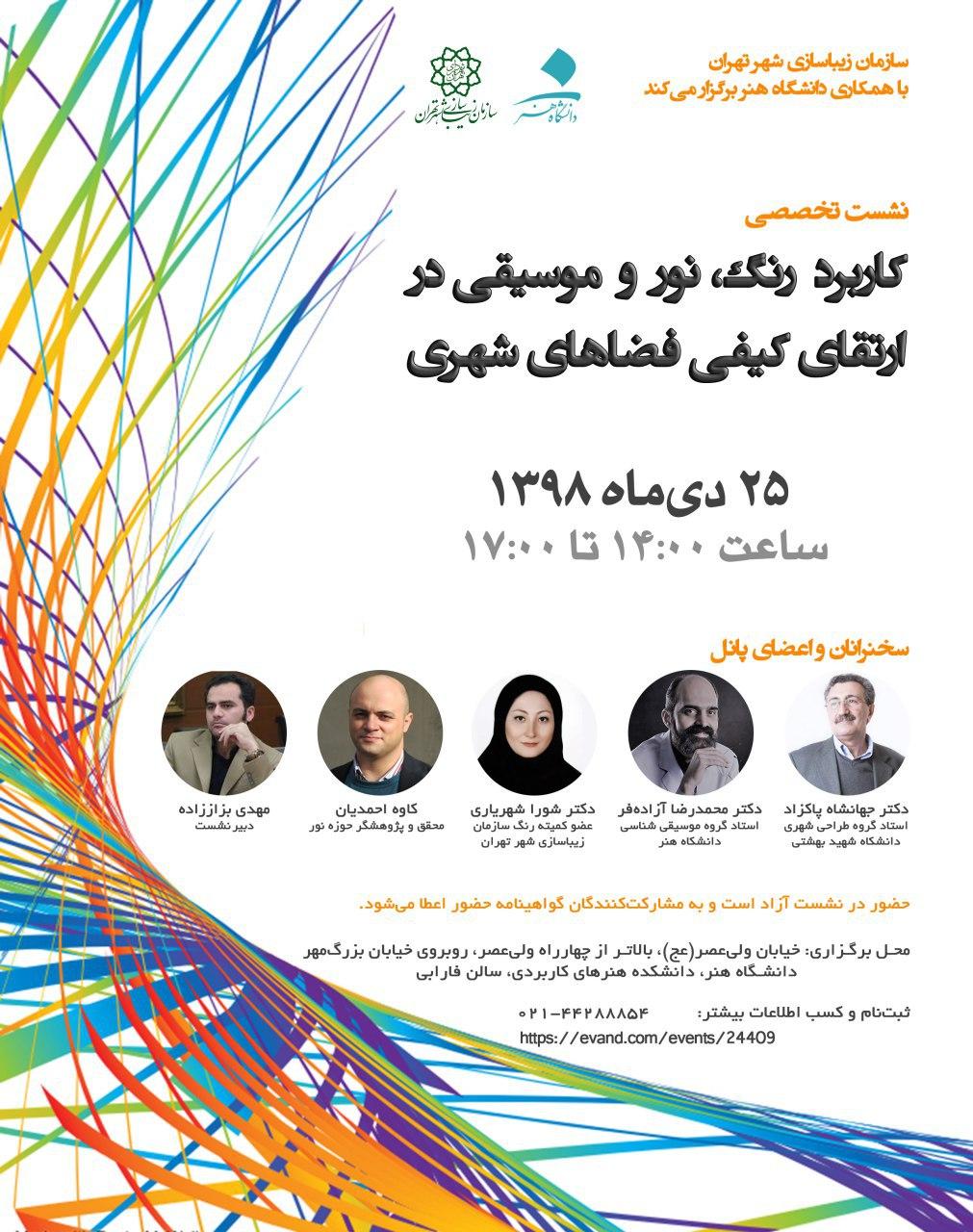سازمان زيباسازي شهر تهران با همکاري دانشگاه هنر، نشست تخصصي تحت عنوان "کاربرد رنگ، نور و موسيقي در ارتقاي کيفي فضاهاي شهري" را چهارشنبه، 25 دي ماه 1398 برگزار مي کند.