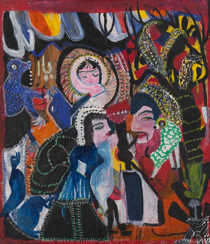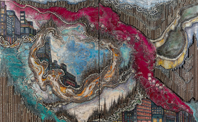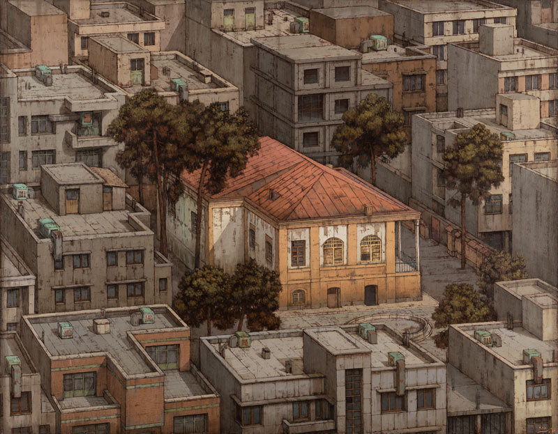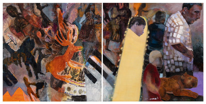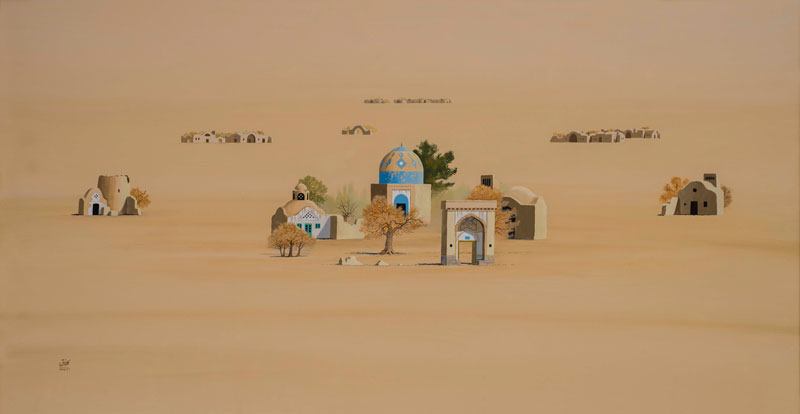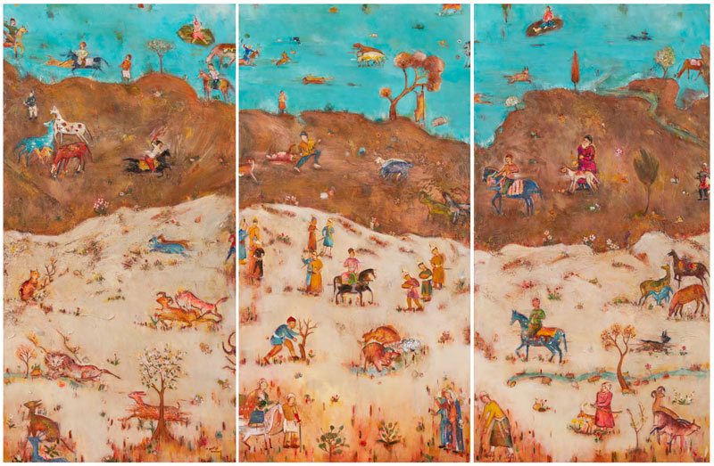 اثري از "مجموعه زندگي مقوايي" هنرمند مسعود کشميري، که تکنيک آن اکريليک روي بوم عنوان شده و به قيمت 48 ميليون تومان فروخته شد.
