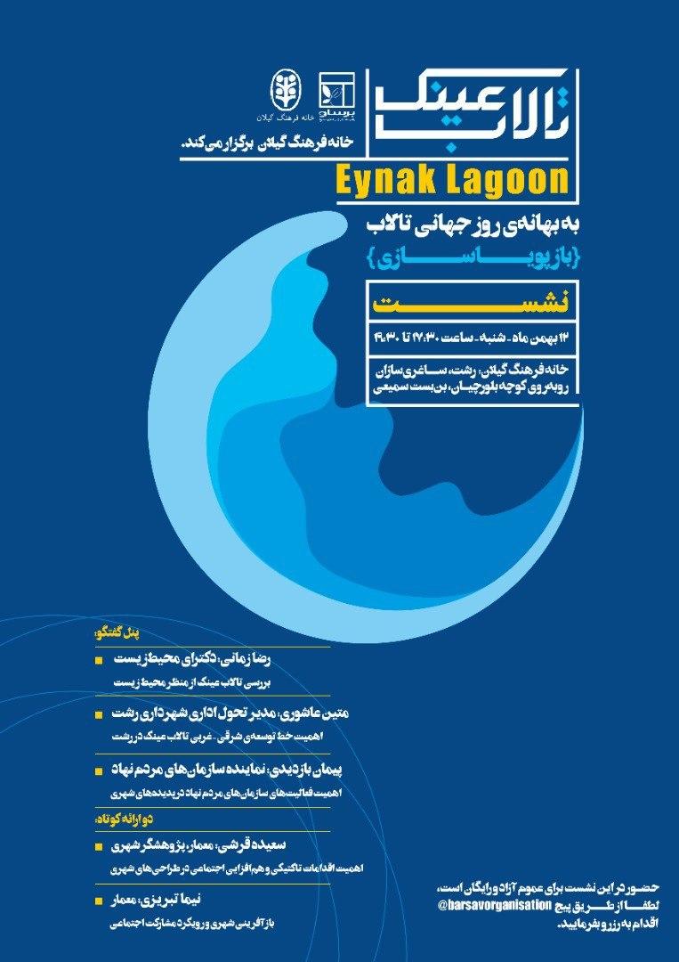 انديشکده برساو با همکاري خانه فرهنگ گيلان، نشست "تالاب عينک – به بهانه‌ي روز جهاني تالاب / بازپوياسازي" را شنبه 12 بهمن ماه برگزار مي کند.