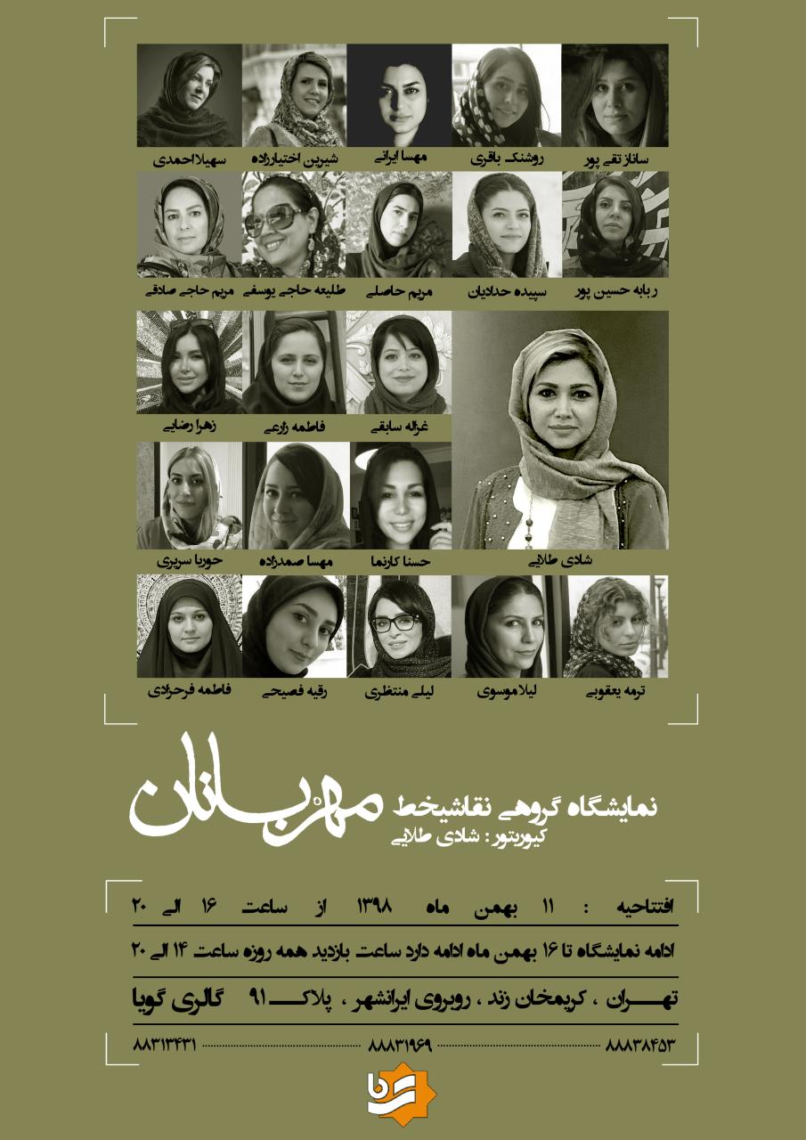 نمايشگاه نقاشي خط هاي گروهي از هنرمندان تحت عنوان "مهربانان" به کيوريتوري شادي طلايي از ساعت 16 الي 20 روز جمعه 11 بهمن ماه در گالري گويا برپا مي شود.