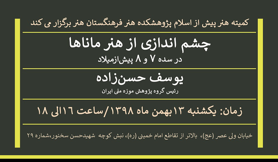 نشست «چشماندازي از هنر ماناها در سده 7 و 8 پيش از ميلاد» با سخنراني يوسف حسنزاده در پژوهشکده هنر برگزار ميشود.