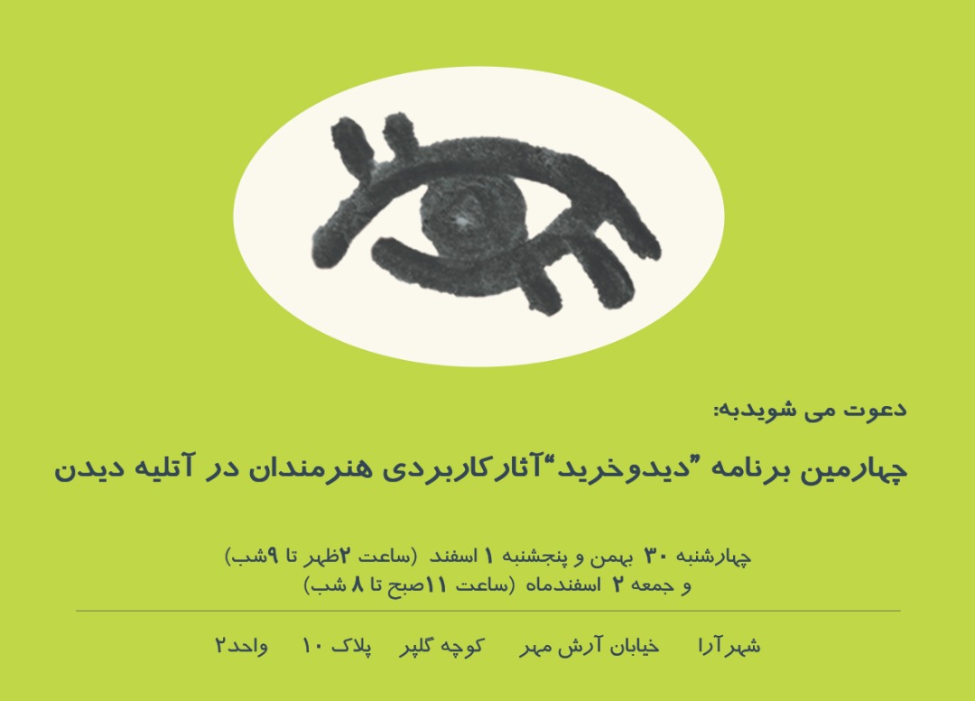 اين برنامه با هدف معرفي هنرمندان و برندهاي نوپاي انجام ميشود. چهارمين برنامه ي ديد و خريد، روزهاي چهارشنبه و پنجشنبه، 30 بهمن و 1 اسفند از ساعت 2 بعد از ظهر تا 9 شب و روز جمعه 2 اسفند از ساعت 11 صبح تا 8 شب برگزار ميشود و آماده ي پذيرايي از شما عزيزان است.
