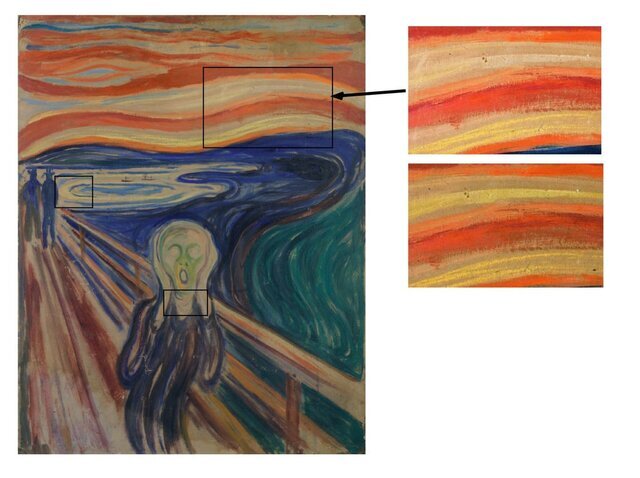 در نتيجه اين پديده، تغييراتي در رنگدانههاي بخشهايي از آسمان و گردن فردي که در اين تابلو نقاشي به تصوير کشيده شده است، به وجود آمده است.
