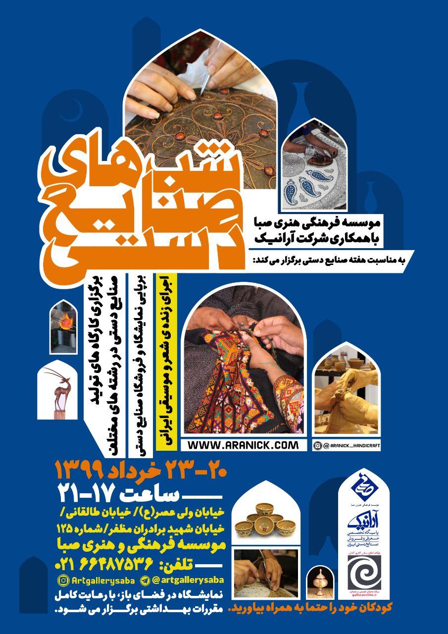 به گزارش گالري آنلاين به نقل از روابط عمومي موسسه فرهنگي، هنري، پژوهشي صبا «شب هاي صنايع دستي»، که با همکاري «شرکت آرانيک» برگزار مي شود، عنوان رويداد ويژه اي است که همزمان با روز جهاني صنايع دستي و آغاز هفته صنايع دستي، بمدت 4 شب از 20 تا 26 خرداد با حضور هنرمندان، توليدکنندگان و استادان صنايع دستي ايراني در رشته هاي مختلف و همراه با برنامه هايي چون اجراي زنده شعرخواني و موسيقي ايراني توسط اساتيد و کارگاه آموزشي براي کودکان شکل خواهد گرفت.