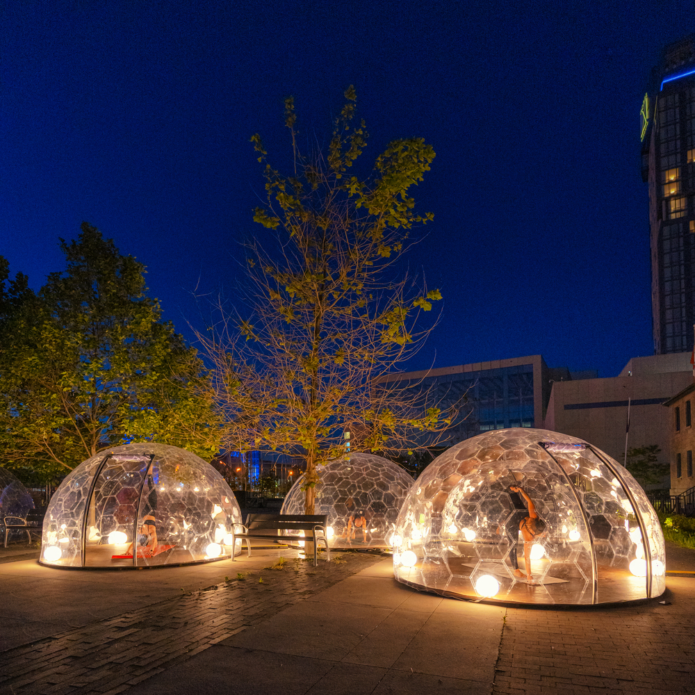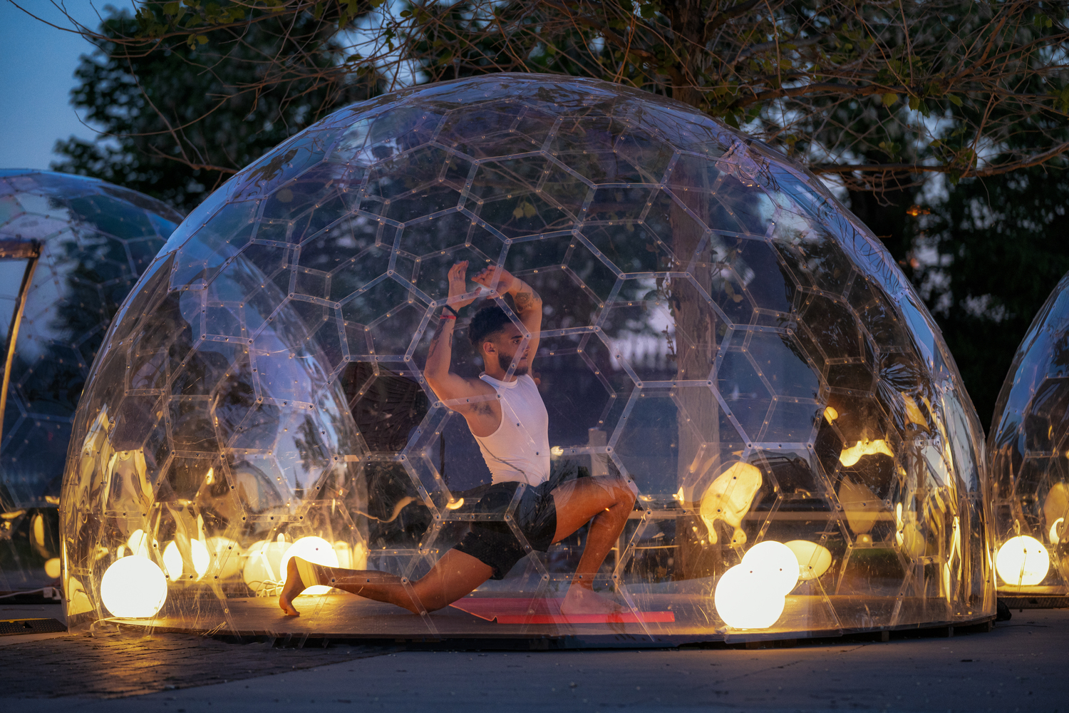 فاصله گذاري اجتماعي براي تمرين يوگا در فضاي باز، استوديوي Lmnts Outdoor Outdoor را بر آن داشت تا 50 گنبد در تورنتو طراحي ايجاد کند.