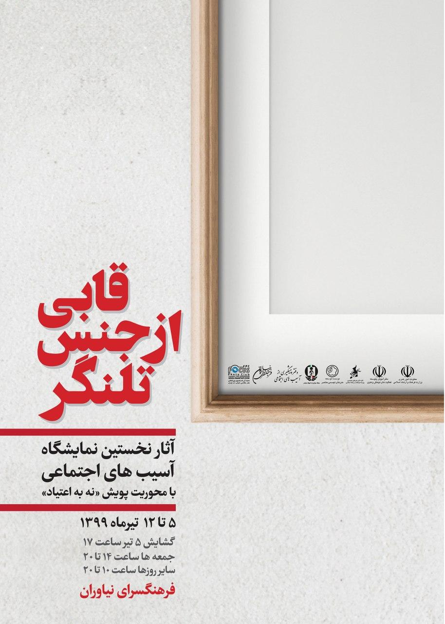 آثار نخستين نمايشگاه آسيب هاي اجتماعي با محوريت پويش نه به اعتياد در دو رشته عکاسي و کاريکاتور با عنوان «قابي از جنس تلنگر» روز پنج شنبه 5 تيرماه 1399 در فرهنگسراي نياوران به نمايش در مي آيد.