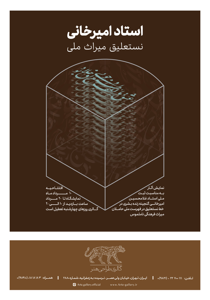 «استاد اميرخاني/ نستعليق ميراث ملي» نمايشگاهي از مجموعه آثار استاد مسلم هنر خوشنويسي ايران، غلامحسين اميرخاني، مدرس، استاد تمام و رئيس شوراي عالي انجمن خوشنويسان ايران، چهره ماندگار و داراي نشان درجه يک فرهنگ و هنر، 10 مرداد در گالري«طراحي هنر»گشايش مييابد.
