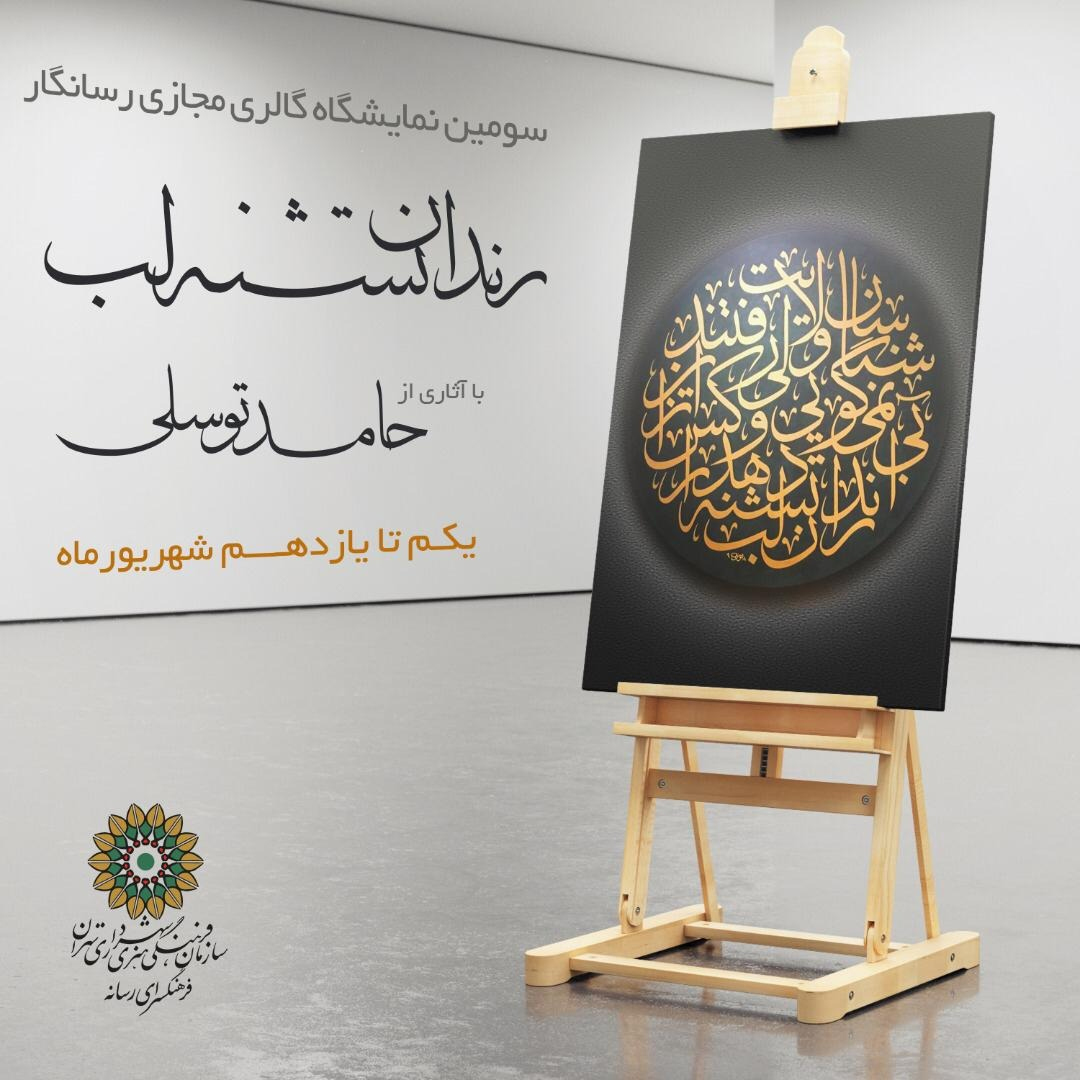 نمايشگاه خوشنويسي «رندان تشنهلب» با آثاري از حامد توسلي به مناسبت ايام محرم در گالري مجازي رسانگار به نمايش در ميآيد.