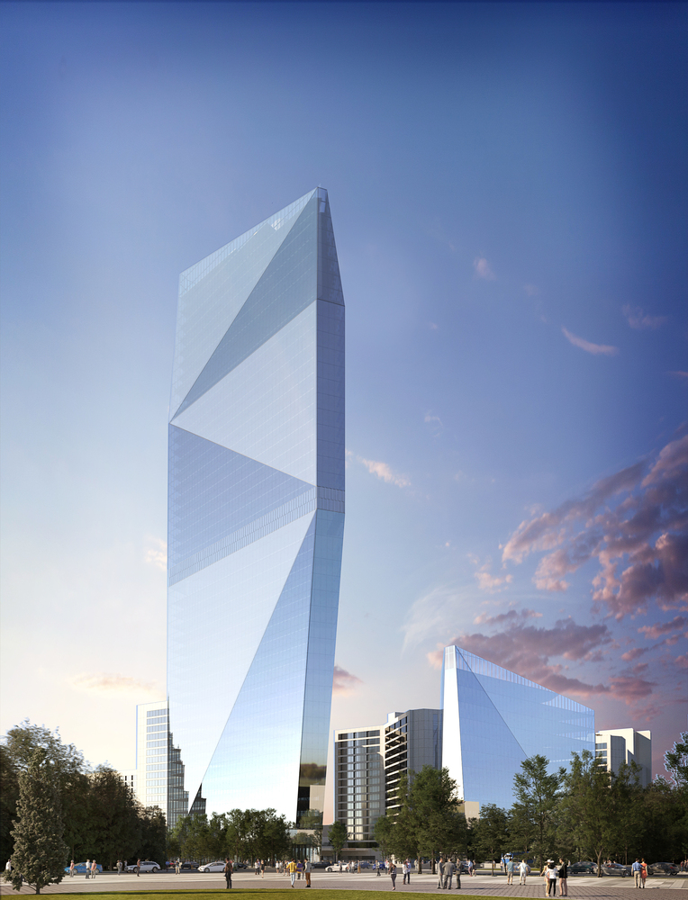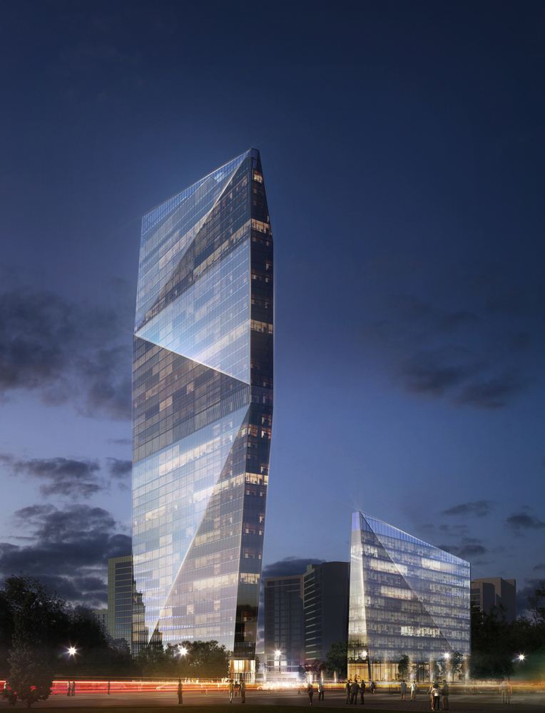 ساختمان اول 57 متري ، 12 طبقه مشرف به مانتولينسايا اوليتسا است، در حالي که ساختمان دوم ، يک ساختمان 200 متري و 44 طبقه، يک شکل مجسمه اي پيچيده را به خود گرفته و با اوليتسا گودا و ميدان و حوض Hermes روبرو شده است.