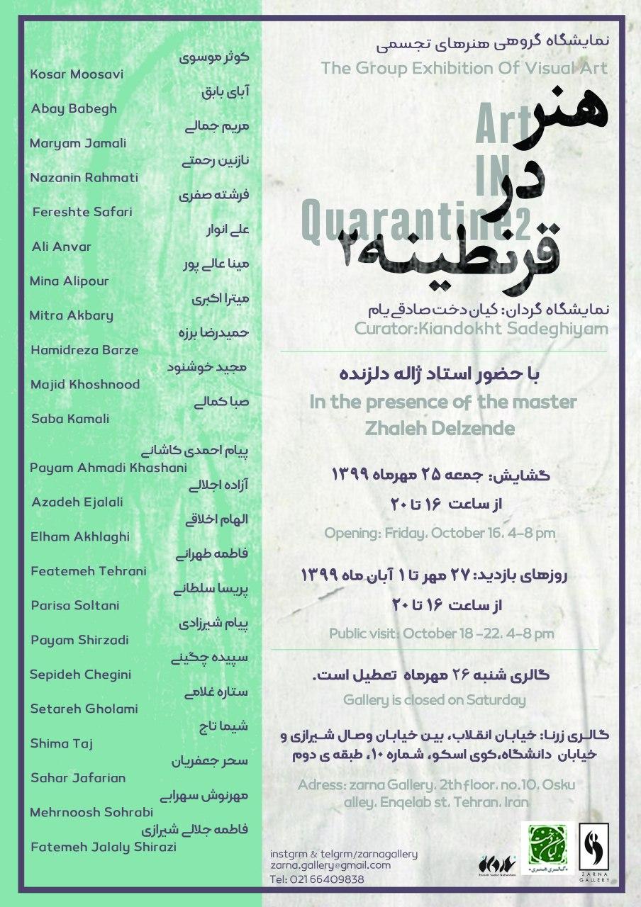 نمايشگاه گروهي تحت عنوان «هنر در قرنطينه» با نمايشگاه گرداني کياندخت صادقي يام و با حضور استاد ژاله دل زنده از روز جمعه 25 مهرماه در گالري زرنا برپا مي شود.