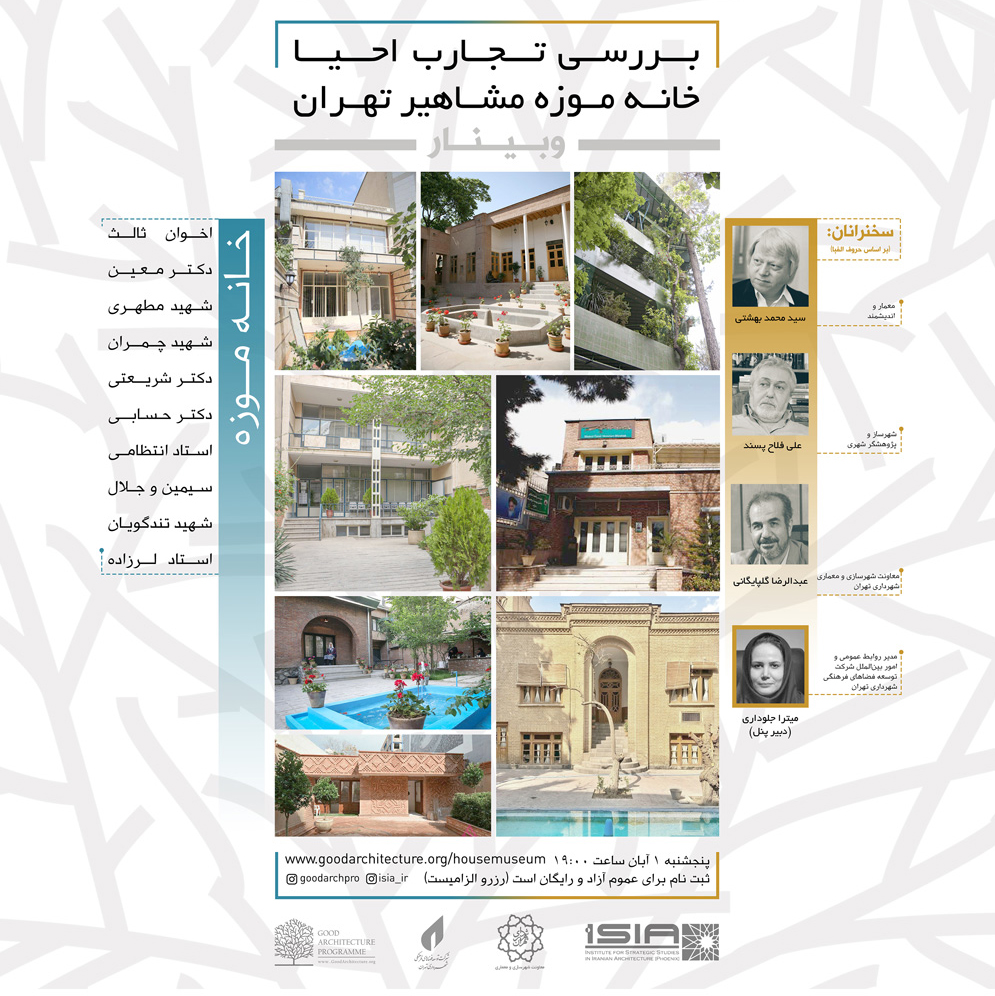 نخستين وبينار از اين سلسله وبينارها به مقدمهاي بر چگونگي، لزوم و چالشهاي اين عرصه اختصاص دارد که با موضوع "بررسي تجارب احياء خانه موزههاي مشاهير تهران" و با حضور سيد محمد بهشتي معمار ، علي فلاحپسند شهرساز و پژوهشگر شهري و عبدالرضا گلپايگاني معاونت شهرسازي و معماري شهرداري تهران برگزار خواهد شد.